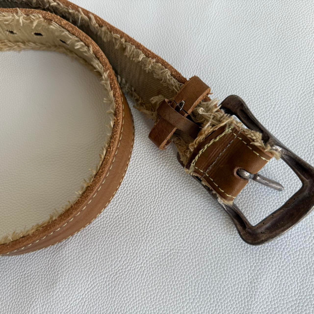 Frayed fabric inside detail, large silver buckle