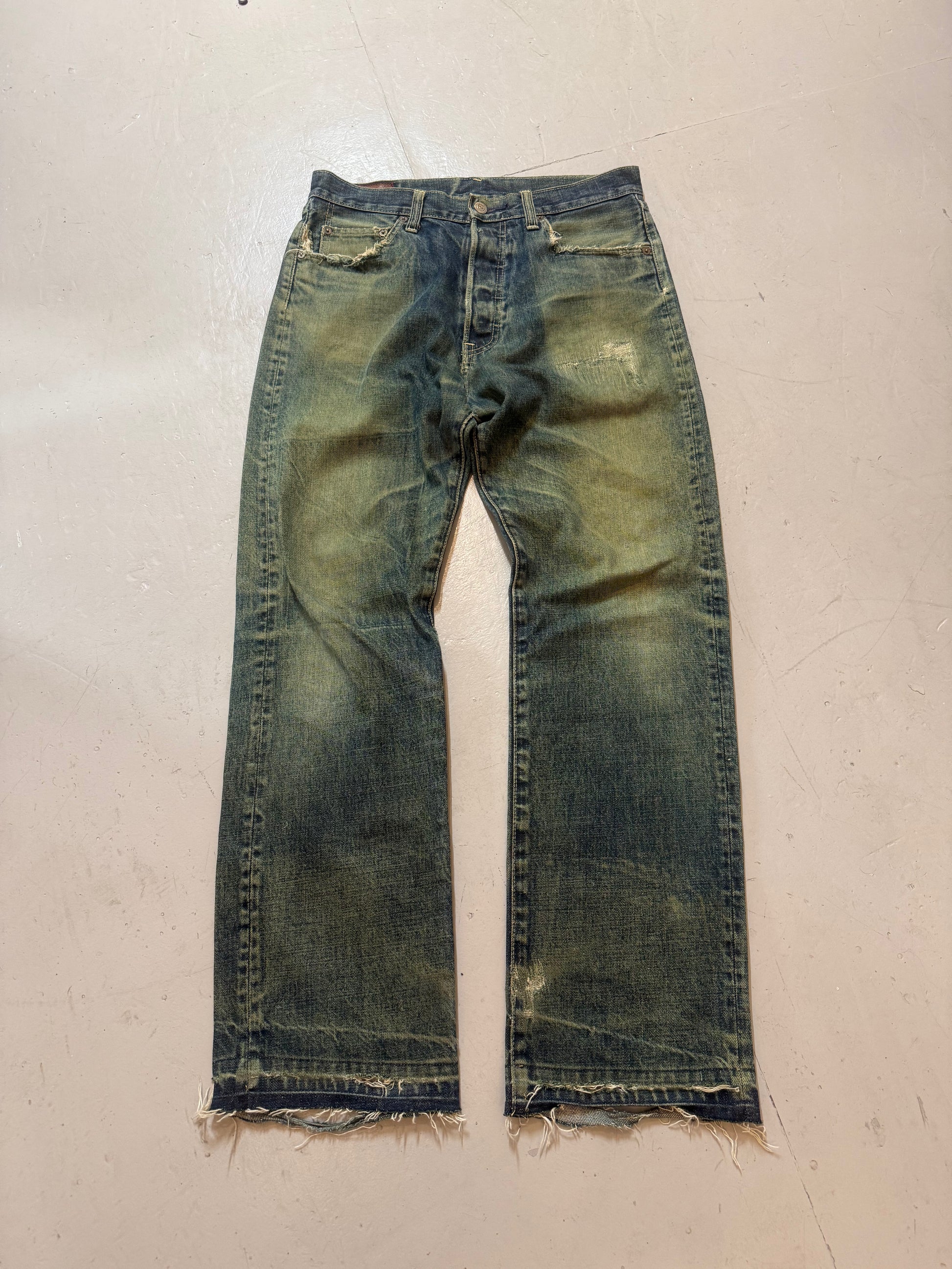 90s/2000s "International World jeans" Japan made denim with unique processed wash and repairs